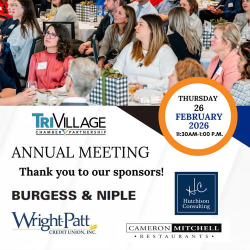 The Tri-Village Chamber Partnership Board of Directors and Staff would like to invite you to attend the 2026 Annual Meeting. The Chamber leadership team will review highlights of 2025 and share what will be coming in 2026. Join us at 11:30 for a networking opportunity and meet our sponsors and exhibitors.